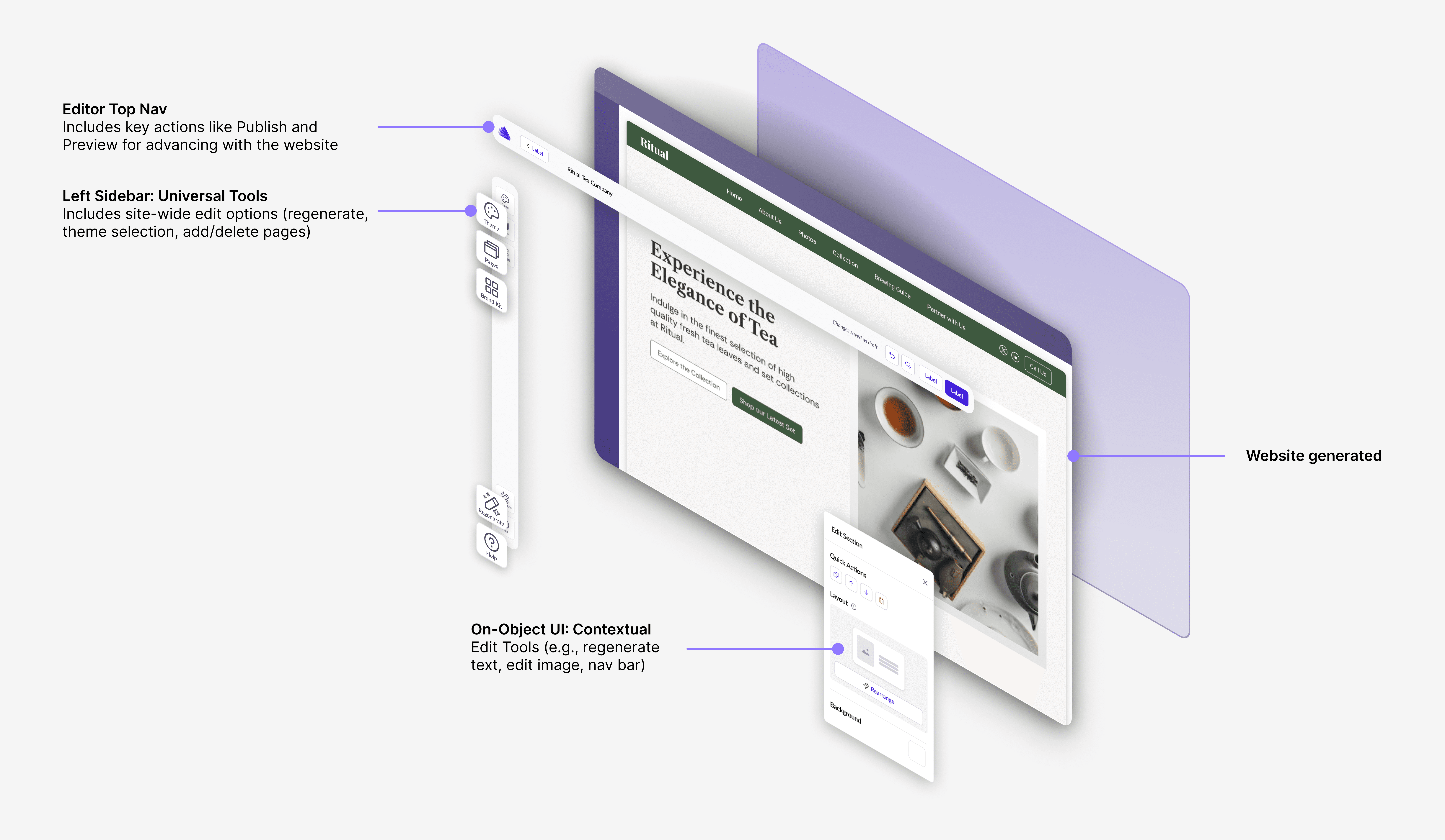 To improve this, we restructured the editor tools into a sidebar for universal actions affecting the entire site, while contextual actions, like regenerating images or sections, were placed as object-specific UI menus.