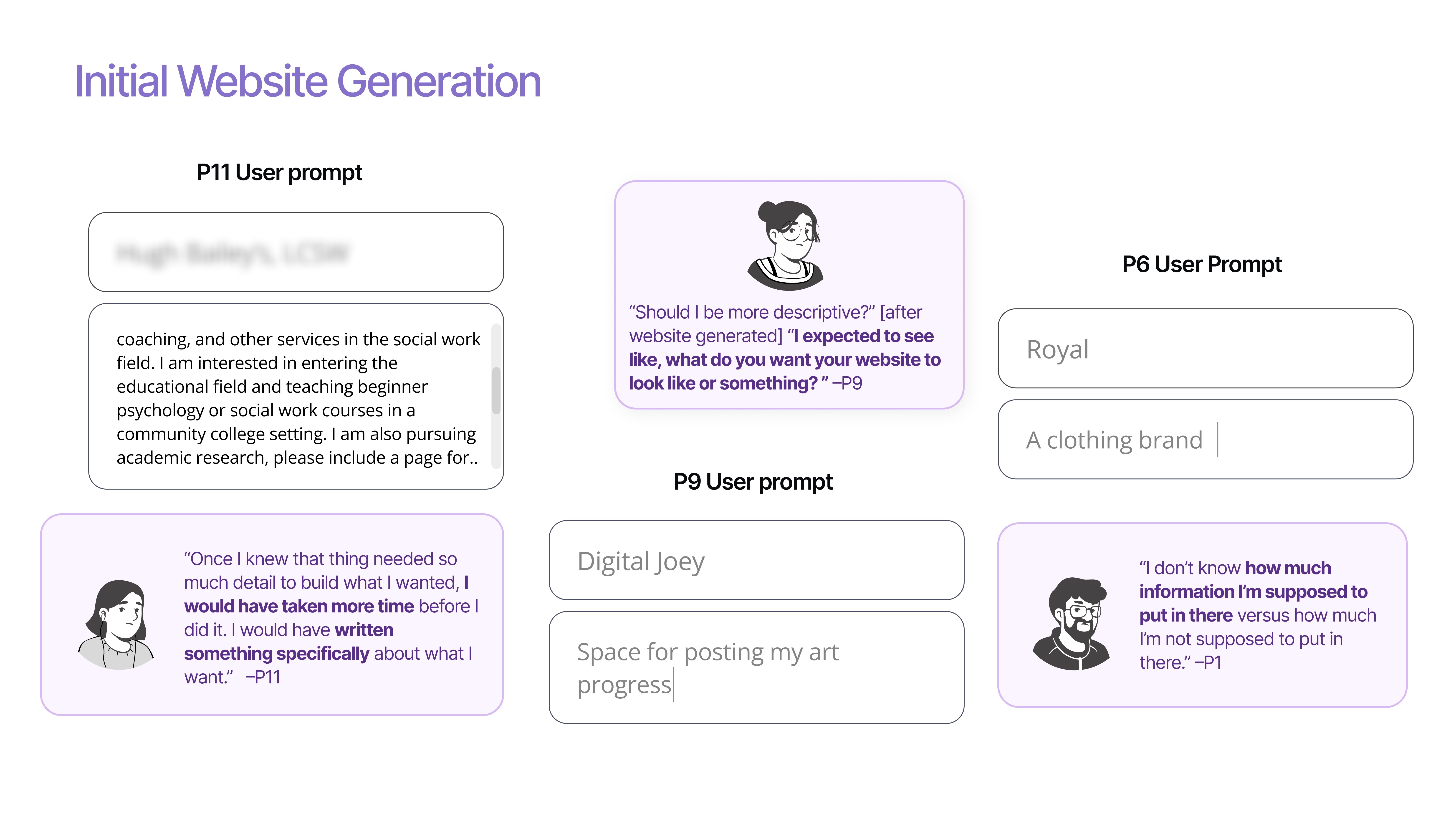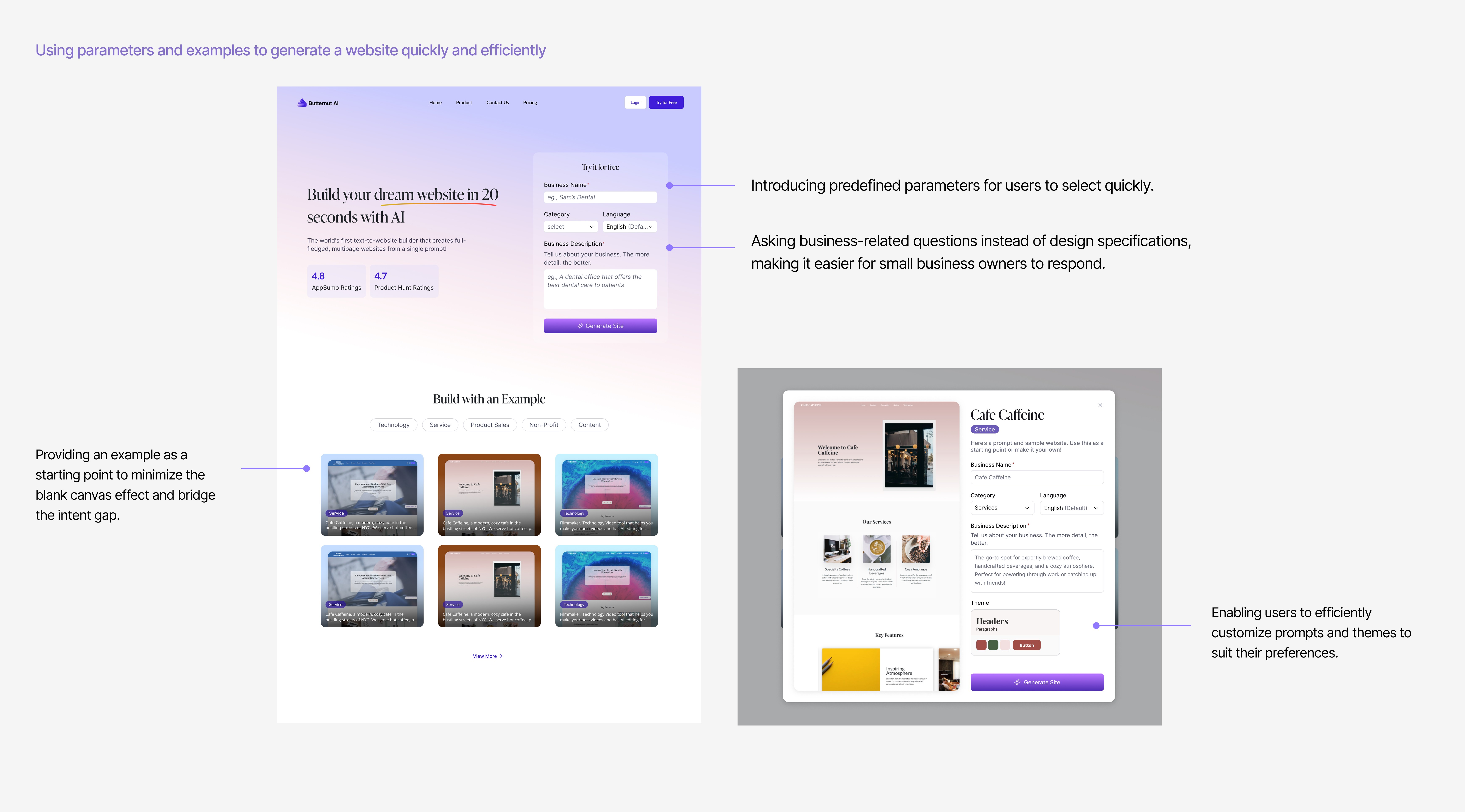 In usability tests, 8/11 participants found their prompts too vague and felt pressured to get them right on the first try. To address this, we introduced parameters such as industry type and website language, allowing the AI to make logical adjustments. Additionally, we added opening questions and example prompts to reduce blank canvas syndrome and boost user confidence in crafting their prompts.